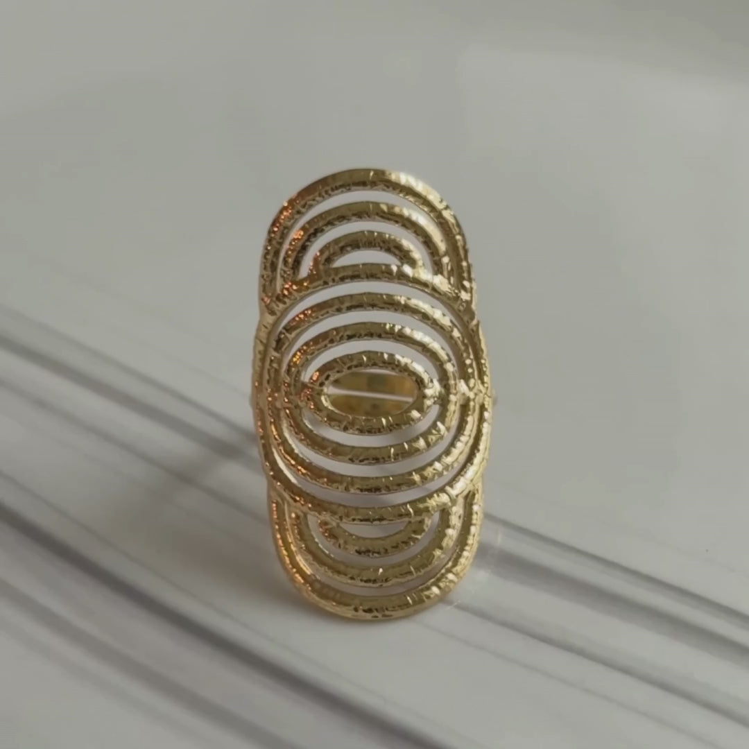 La bague Larlossa attire le regard avec son design en spirales texturées qui rappellent les reflets du soleil sur les vagues. Une pièce audacieuse et hypnotisante, pensée pour sublimer vos mains avec élégance.